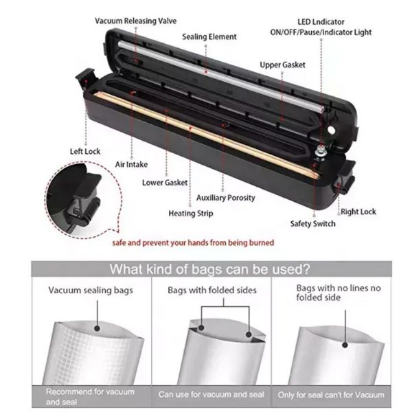 - Consegue fechar a vácuo qualquer saco de plástico.
