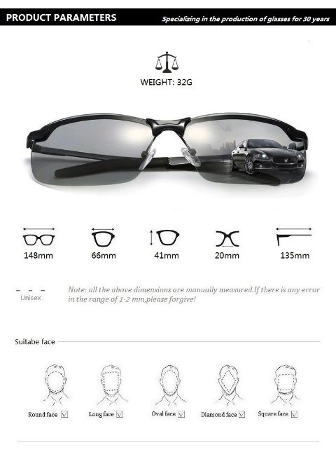 Estes óculos de sol são superiores aos óculos de sol convencionais de três formas: quando se movimenta dentro ou fora de casa, as lentes ajustam-se automaticamente às condições de luminosidade reduzida. Segundo, as lentes polarizadas reduzem o brilho e o reflexo. As camadas de proteção UV protegem de raios UVA/UVB nocivos.
