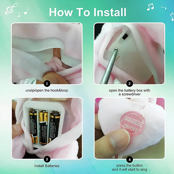Pode acessar facilmente o compartimento da bateria através de uma abertura de velcro na parte de trás do brinquedo. Coloque o interrutor em “ON” e a magia começa. Fabricado com materiais de alta qualidade, a Roxy é macia, durável e segura para as crianças.